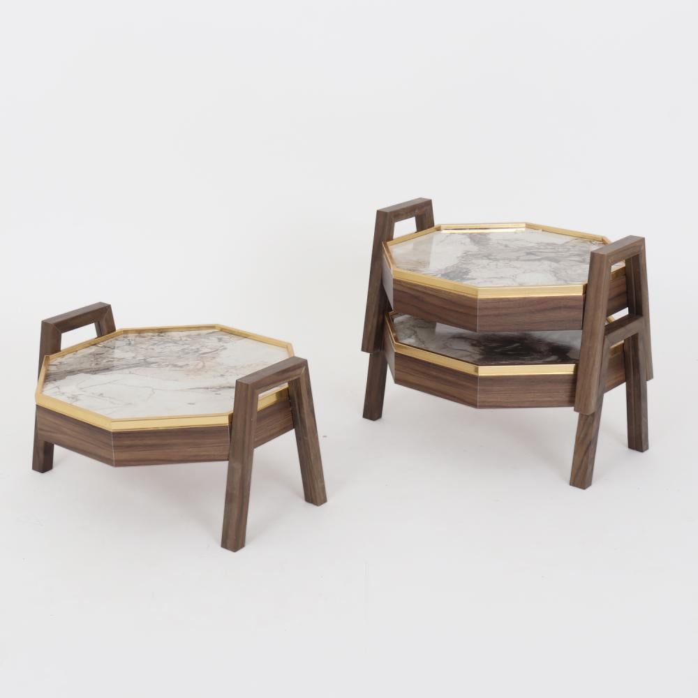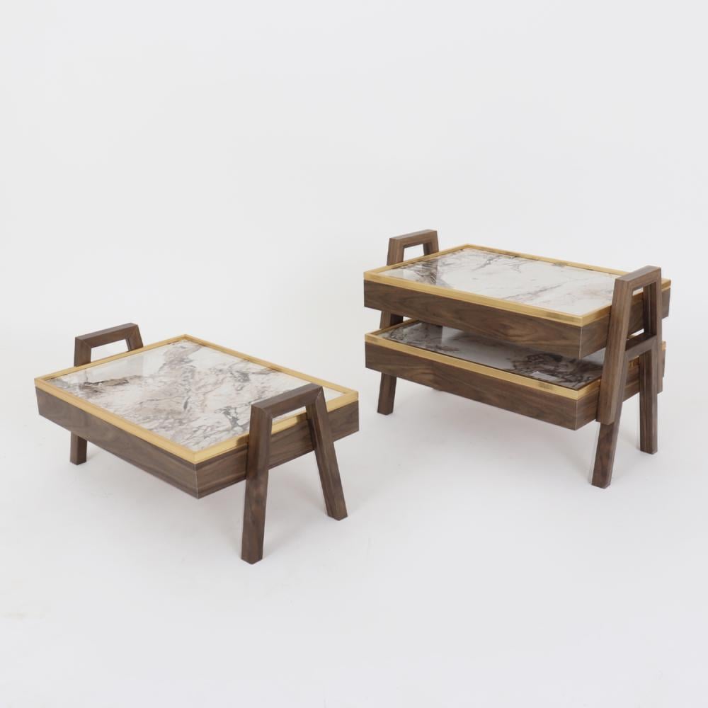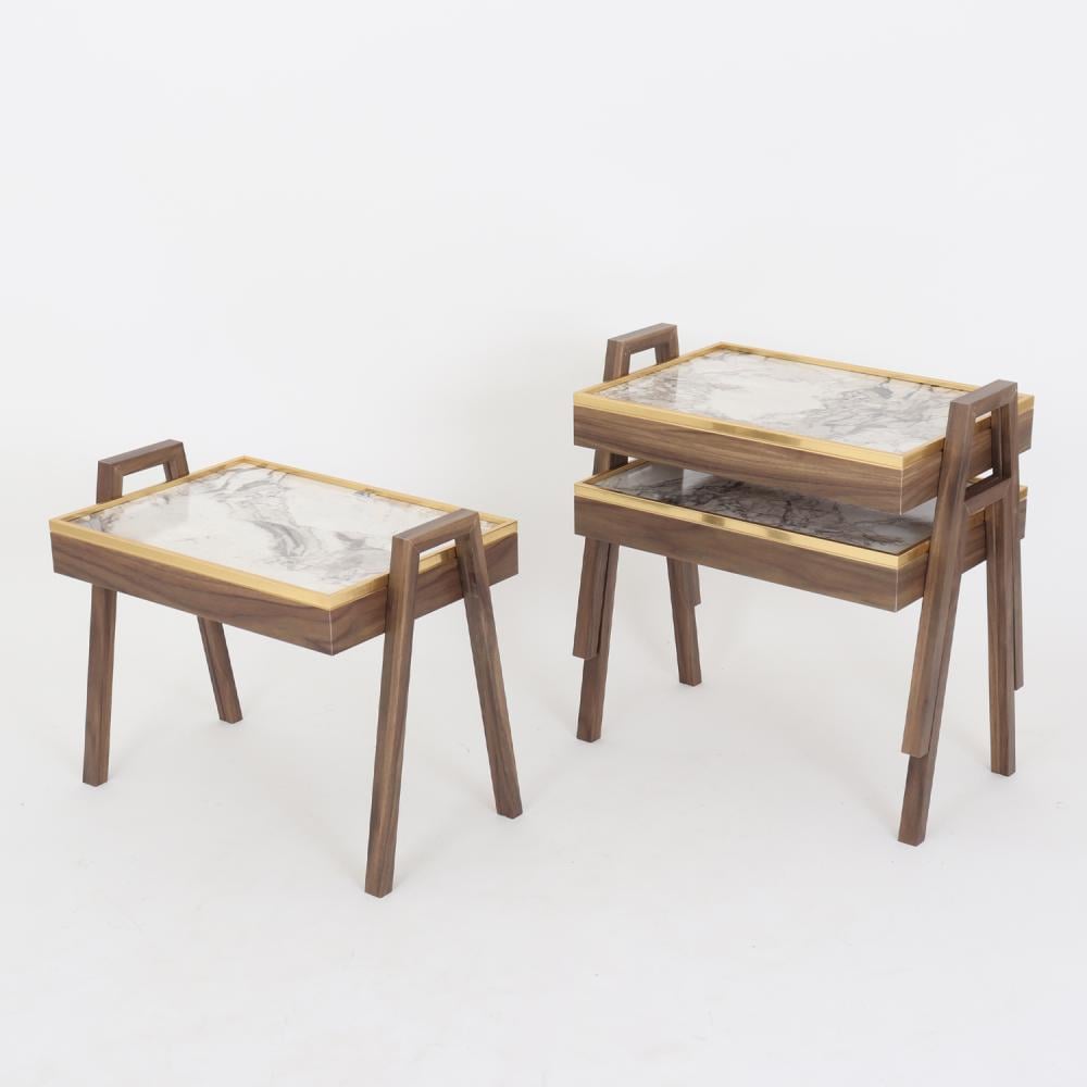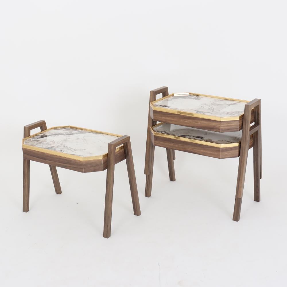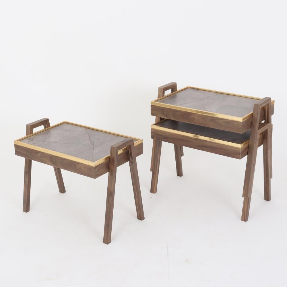 طقم طاولات خدمة خشبية داكنة - سطح شبيه الرخام رمادي