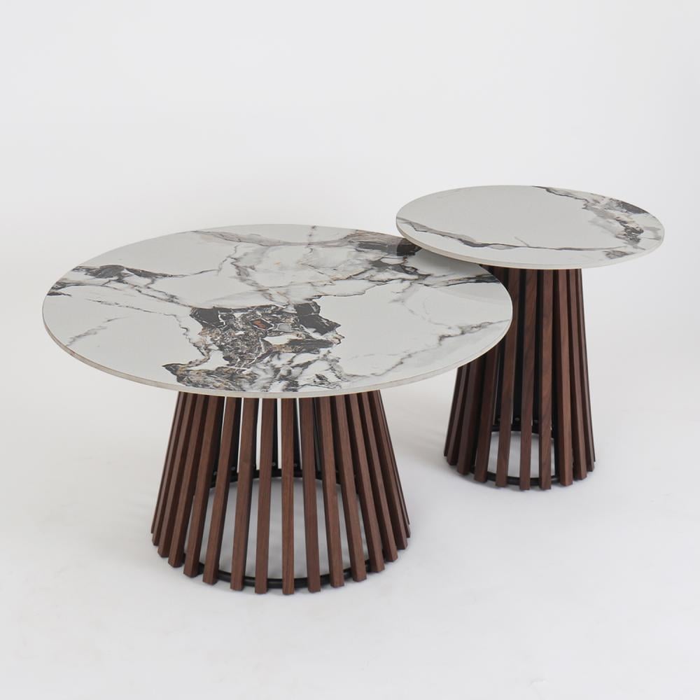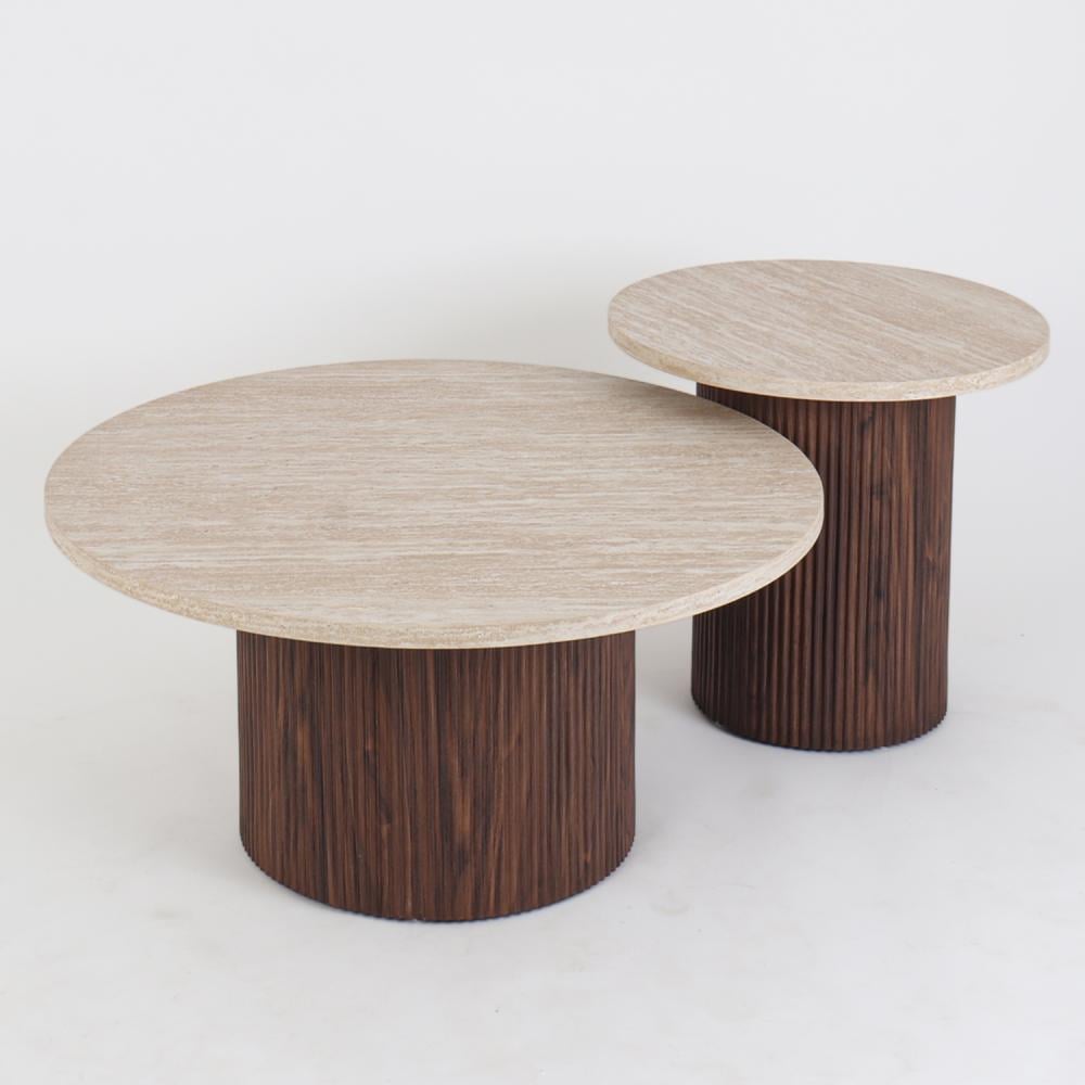 طقم طاولات دائرية بيج حجري بقاعدة خشبية - 2 قطعة
