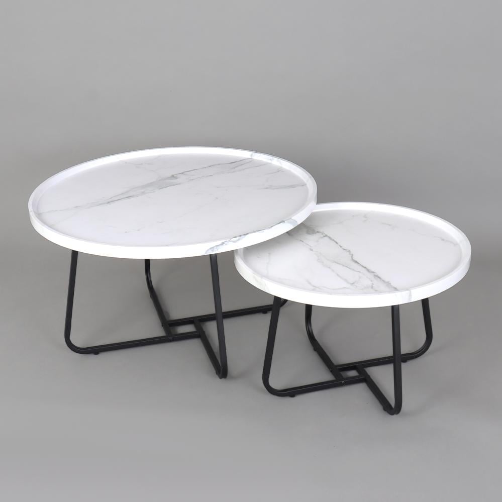 طقم طاولات قهوة وسط خشب بقواعد معدن - أبيض رخامي + أسود